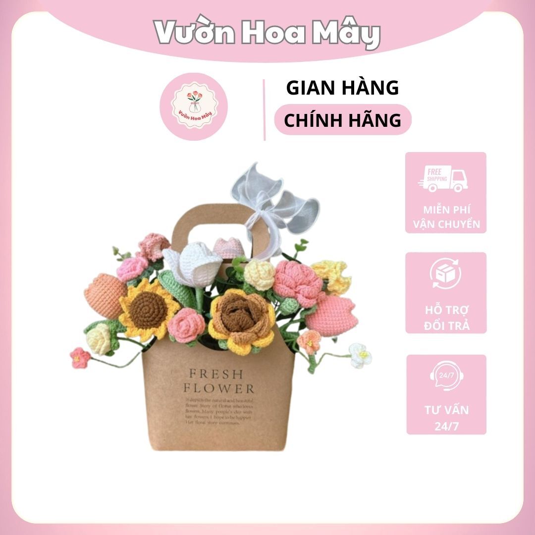 - Những Bông Hoa Len Móc Tay Tinh Xảo: Điểm nhấn của sản phẩm là những bông hoa len đủ màu sắc và kiểu dáng được móc thủ công một cách tỉ mỉ. Từng cánh hoa, chiếc lá đều được chăm chút, tạo nên một tổng thể hài hòa và sống động như một vườn hoa thu nhỏ.